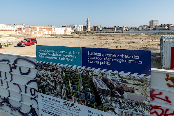 Ainsi dès le démarrage des études de programmation, une réflexion poussée a été partagée avec les collectivités, l’AP-HP et les services de l’Etat sur les enjeux d’insertion urbaine de cet ensemble de près de 7 ha. La nécessité d’ouverture sur la ville, d’animation des rez-de-chaussée, de prise en compte du bâti alentour, mais aussi la lutte contre les îlots de chaleur sont ressortis comme autant d’enjeux à intégrer dans le dialogue compétitif qui s’est déroulé de 2021 à 2023. Pour accompagner l’arrivée de cette opération, l’EPT Plaine Commune, la ville de Saint-Ouen, le département et l’aménageur SEQUANO travaillent aussi à la définition de nouveaux espaces publics à même de recevoir quotidiennement et dans de bonnes conditions les 7 500 étudiants et les personnels concernés.